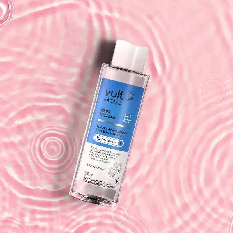 Benefícios para a pele ao usar a Água Micelar Facial Vult: A fórmula suave e eficaz da Água Micelar Vult proporciona uma limpeza profunda e delicada. Ela remove impurezas, maquiagem e até mesmo o excesso de oleosidade, sem ressecar ou deixar a pele irritada. Além disso, proporciona hidratação e frescor imediato, deixando sua pele suave e bem cuidada, pronta para o próximo passo da sua rotina de cuidados.