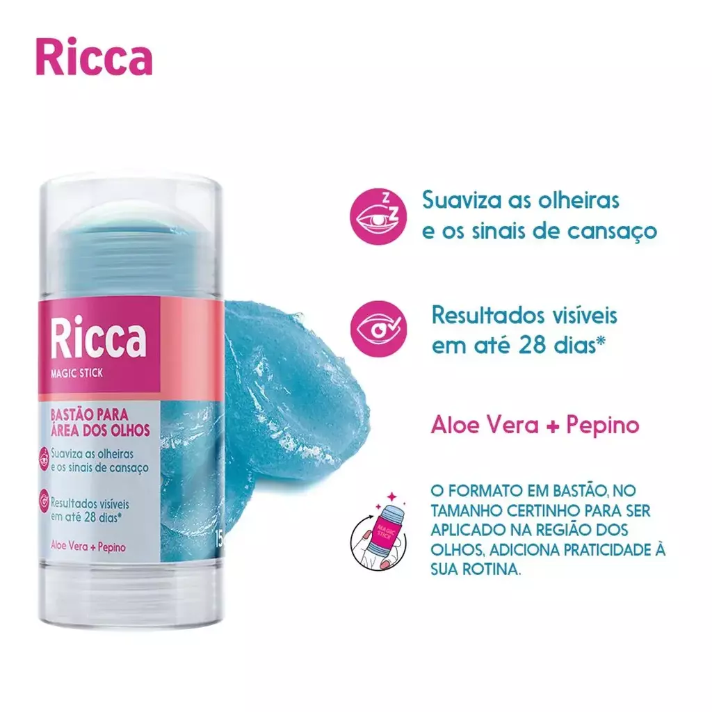 O bastão para a área dos olhos Ricca é um produto especialmente desenvolvido para o cuidado com a área dos olhos. Com sua formulação rica em ingredientes hidratantes e refrescantes, como aloe vera e pepino, ele ajuda a suavizar olheiras, reduzir bolsas e minimizar sinais de cansaço, promovendo uma aparência mais fresca e descansada.