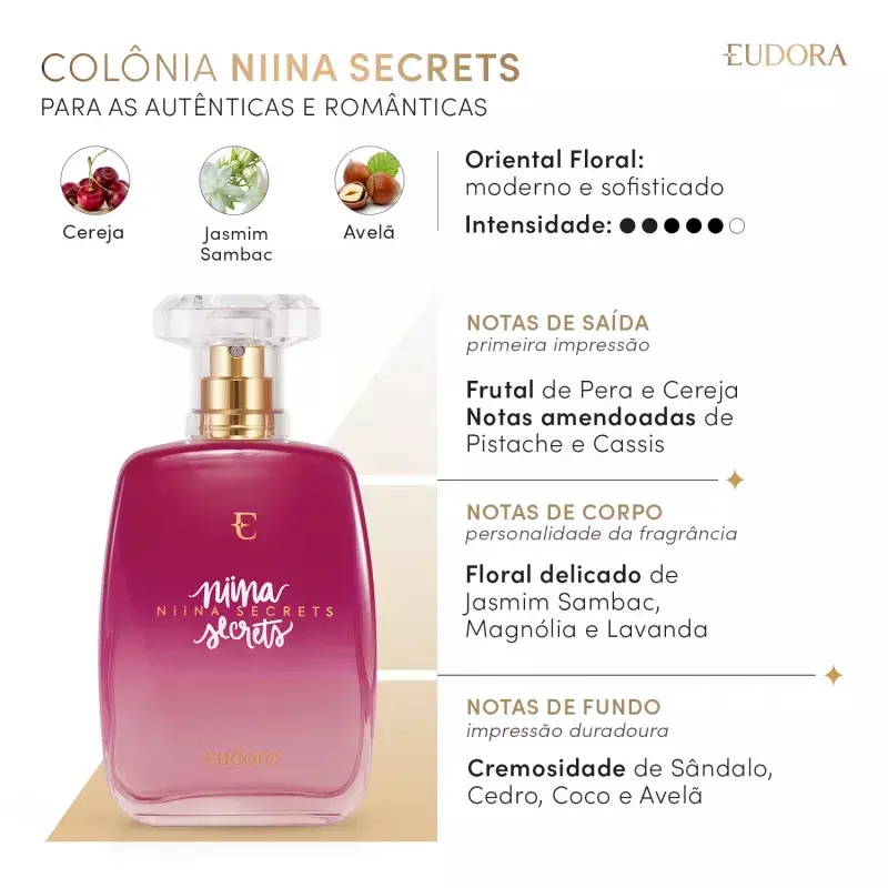 Com uma combinação de notas florais, frutadas e adocicadas, Niina Secrets revela um perfume que equilibra doçura com sofisticação. Ideal para quem deseja exalar feminilidade com personalidade marcante.