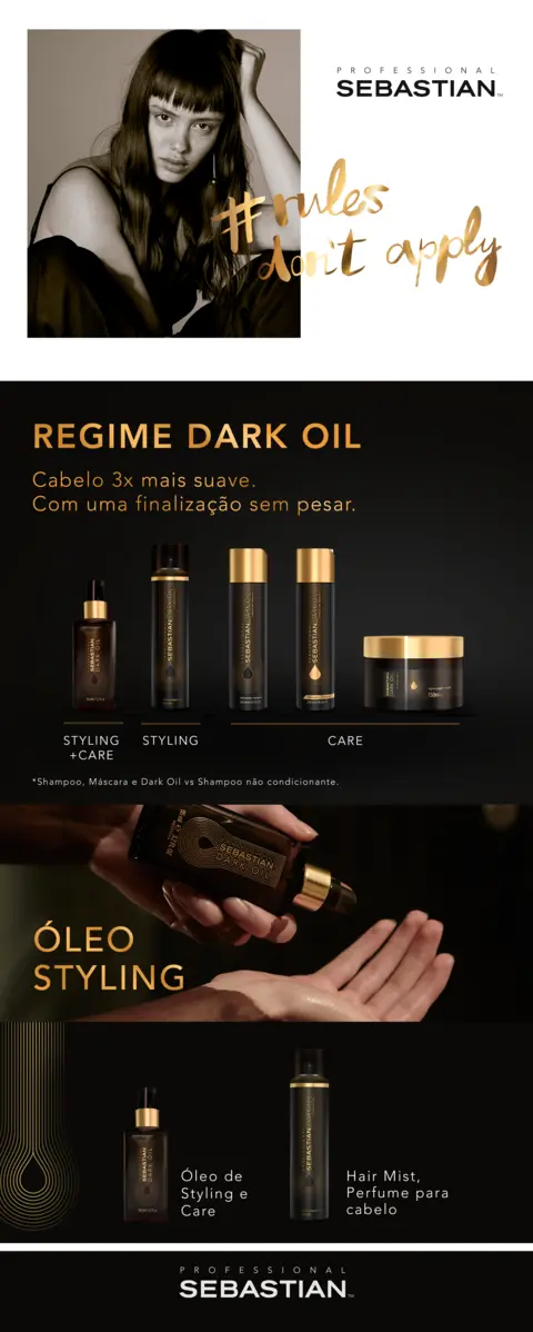 Sebastian Professional Dark Oil é um óleo de styling que une tratamento com finalização. Sua fórmula intensa, mas leve, protege dos raios UV, controla o frizz, promove brilho e aumenta a suavidade por até 48 horas. Além disso, proporciona textura e facilita a criação de penteados. Tudo isso com alta durabilidade, sem pesar e trazendo nutrição ao cabelo!